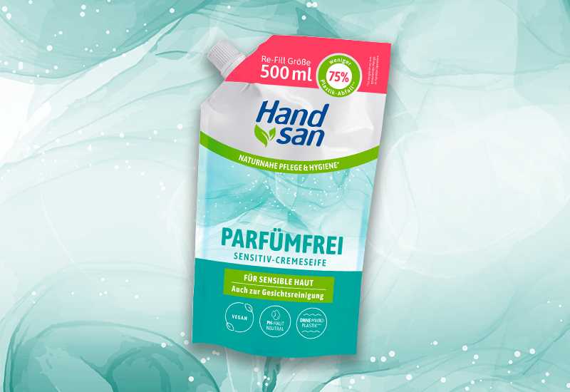 Handsan 100% PARFÜMFREI Cremeseife gibt es im 500 ml-Nachfüllbeutel.